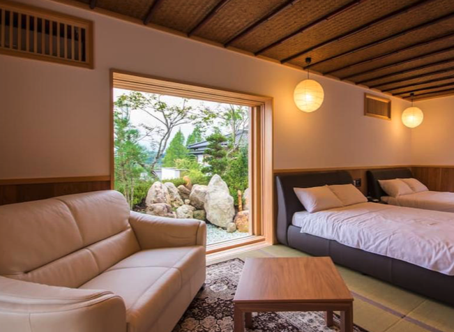 주변 관광지로는 아기자기한 상점이 늘어서 유후인 민예촌과 운치있는 풍경을 자랑하는 긴린코 호수가 차로 5분 거리에 있다. 또한, 쇼핑을 즐기기 좋은 캐널시티 하카타는 차로 1시간 30분 거리에 있다. 저녁에 여유롭게 술 한잔과 함께 휴식을 취할 수 있는 아늑한 라운지 바가 있다.